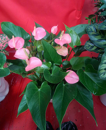 粉掌,為多年生常綠草本花卉。性喜溫熱多濕而又排水良好的環境,怕干旱和強光暴曬。其適宜生長晝溫為26~32℃,夜溫為21~32℃。所能忍受的最高溫為35℃,可忍受的低溫為14℃。光強以16000~20000 lx為宜,空氣相對濕度(RH)以70%~80%為佳。其株高一般為50~80cm,因品種而異。具肉質根,無莖,葉從根莖抽出,具長柄,單生、心形,鮮綠色,葉脈凹陷。花腋生,佛焰苞蠟質,正圓形至卵圓形,鮮紅色、橙紅肉色、白色,肉穗花序,圓柱狀,直立